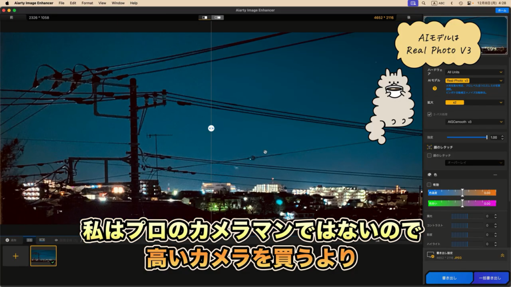 AIモデルは、Real Photo v3を使用しました、なぜかこのAIモデルだけ拡大率が2倍までなんですよね。