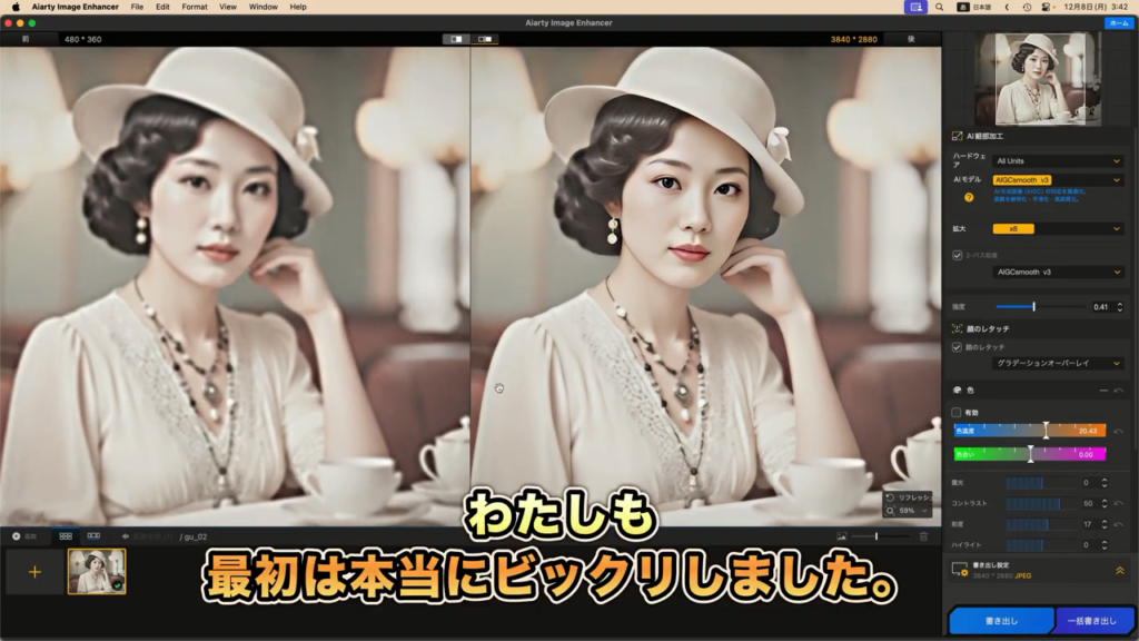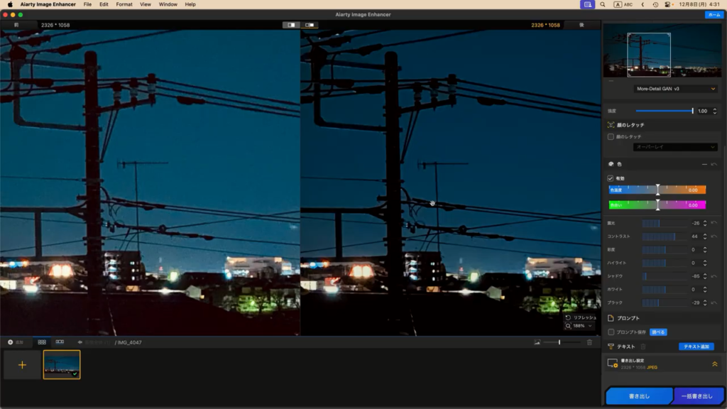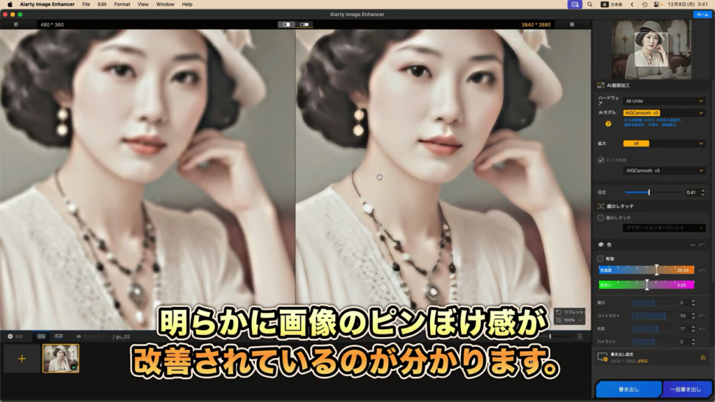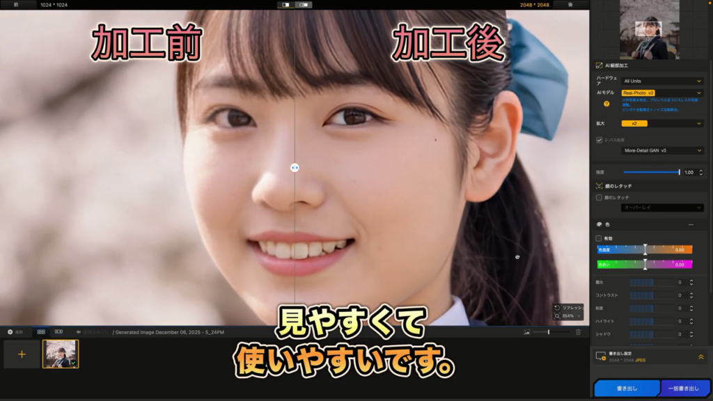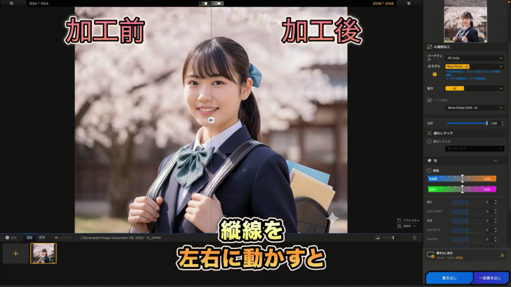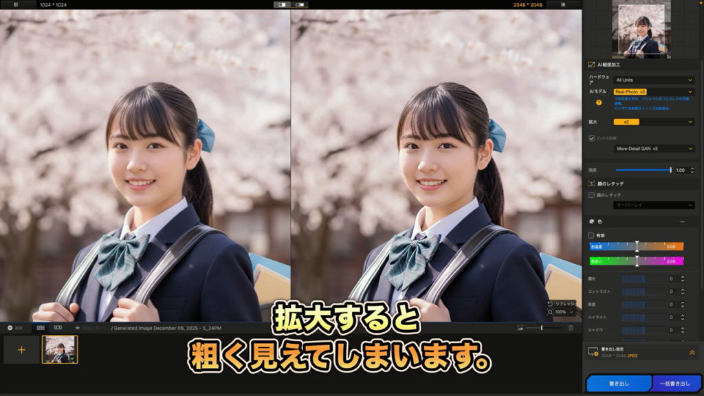 プレビュー画面の左側が“元の画像”、右側が“AIで高画質化された画像”です。