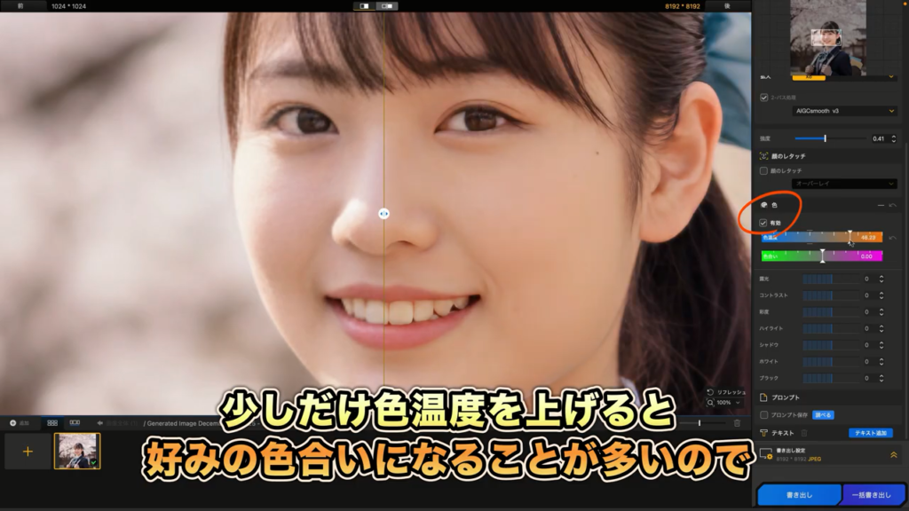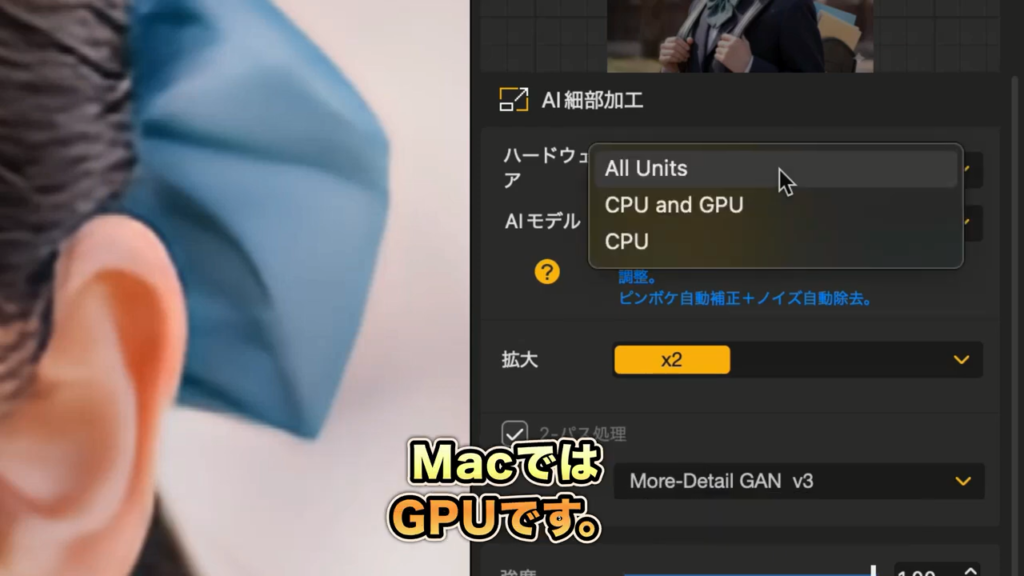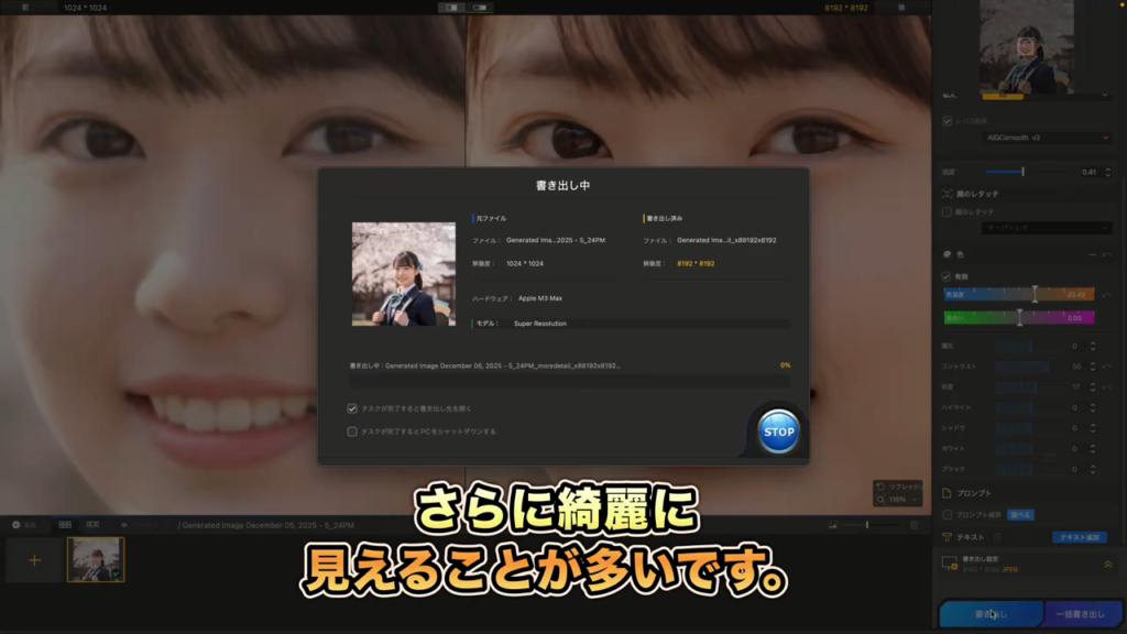 拡大率を上げるほど画質は良くなりますが、その分、ファイルサイズも大きくなるので、私はいつも4Kくらいにしています。高画質化だけで、アップスケール(拡大)したくないときは「x1」で設定します。