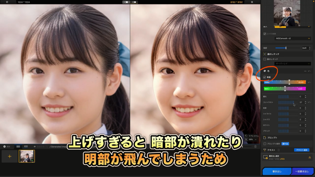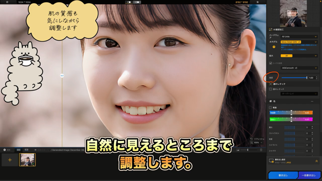 肌のテクスチャーが綺麗になりすぎると、AI画像って分かっちゃうんですよね。ある程度は質感を残した方が良いと思います。