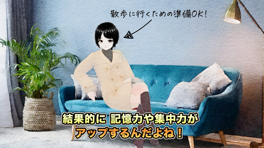 クマちゃん:「歩くことで血の巡りが良くなって、脳が活性化されるの。結果的に記憶力や集中力がアップするんだよね!」
