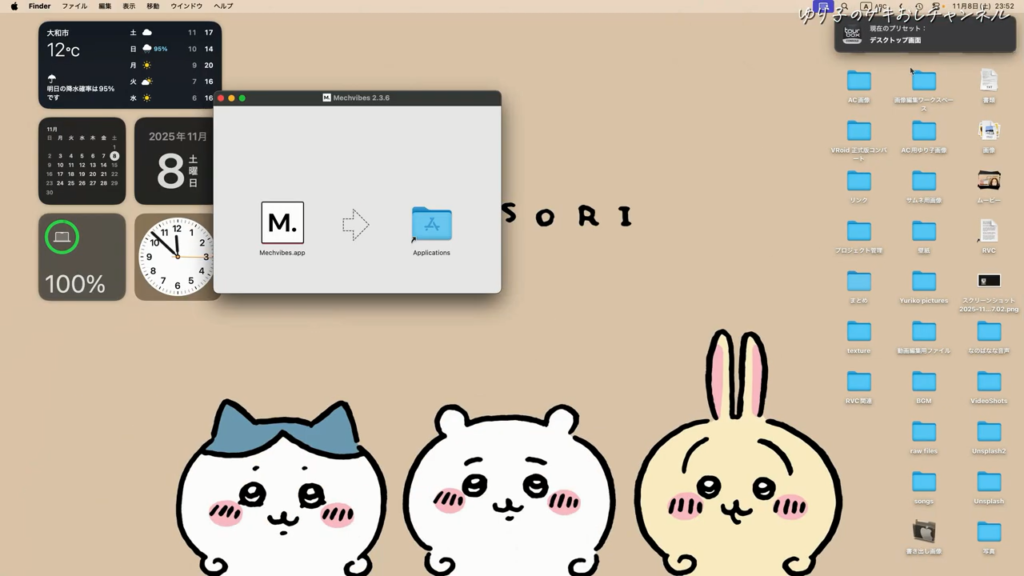 ダウンロードしたファイルを「アプリケーションフォルダ」に移動します。