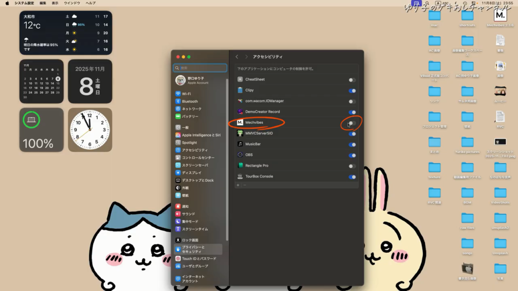そのときは「システム設定を開く」をクリックし、「Mechvibes」を探してスイッチをONにしてください。