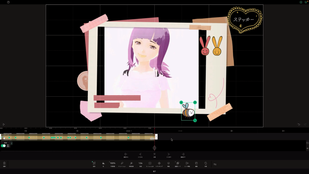 VLLOには可愛いアニメーションするステッカーが多くありますが、キーフレームを使って移動させることでより魅力的になりますね。